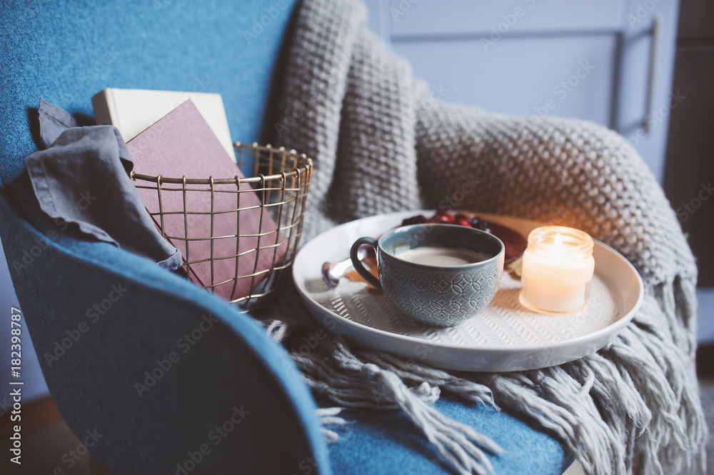 Cozy Winter Weekend At Home Morning With Coffee Or Cocoa Berry Pie Books Warm Knitted Blanket And Nordic Style Chair Hygge Concept Stock Photo Adobe Stock